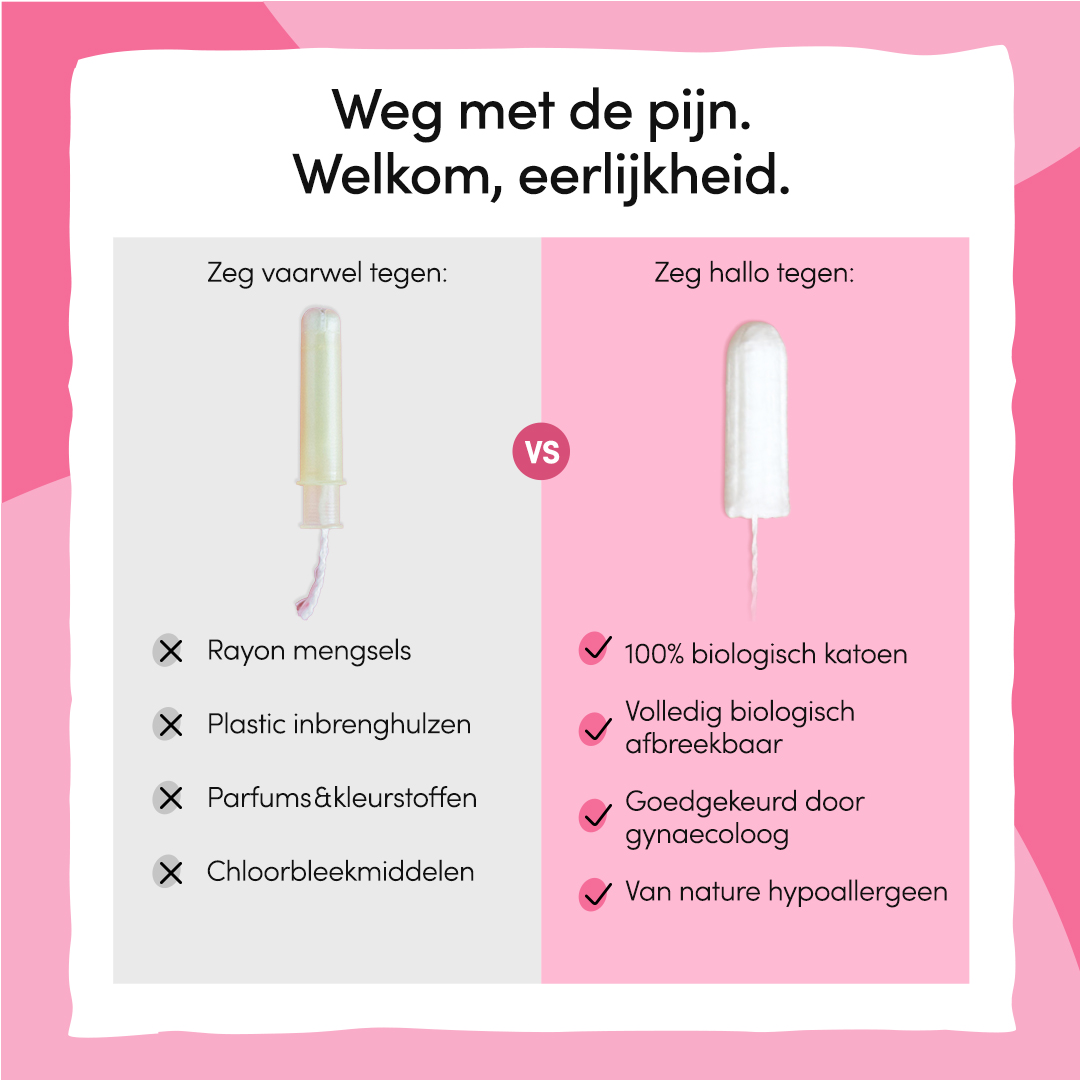 Geen Chemicaliën: Onze tampons bevatten geen chemicaliën of verborgen ingrediënten, en bieden pure en natuurlijke bescherming.